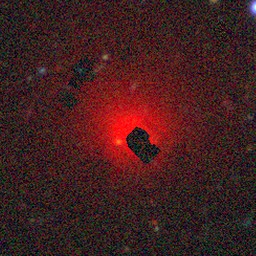 The dark spot in the middle is due to a step in the image processing called ‘outlier rejection’ where we try to ignore parts of the sky that are changing – because the Legacy Surveys mostly care about distant galaxies. If it was working perfectly we would have masked out (ignored) the whole red comet!