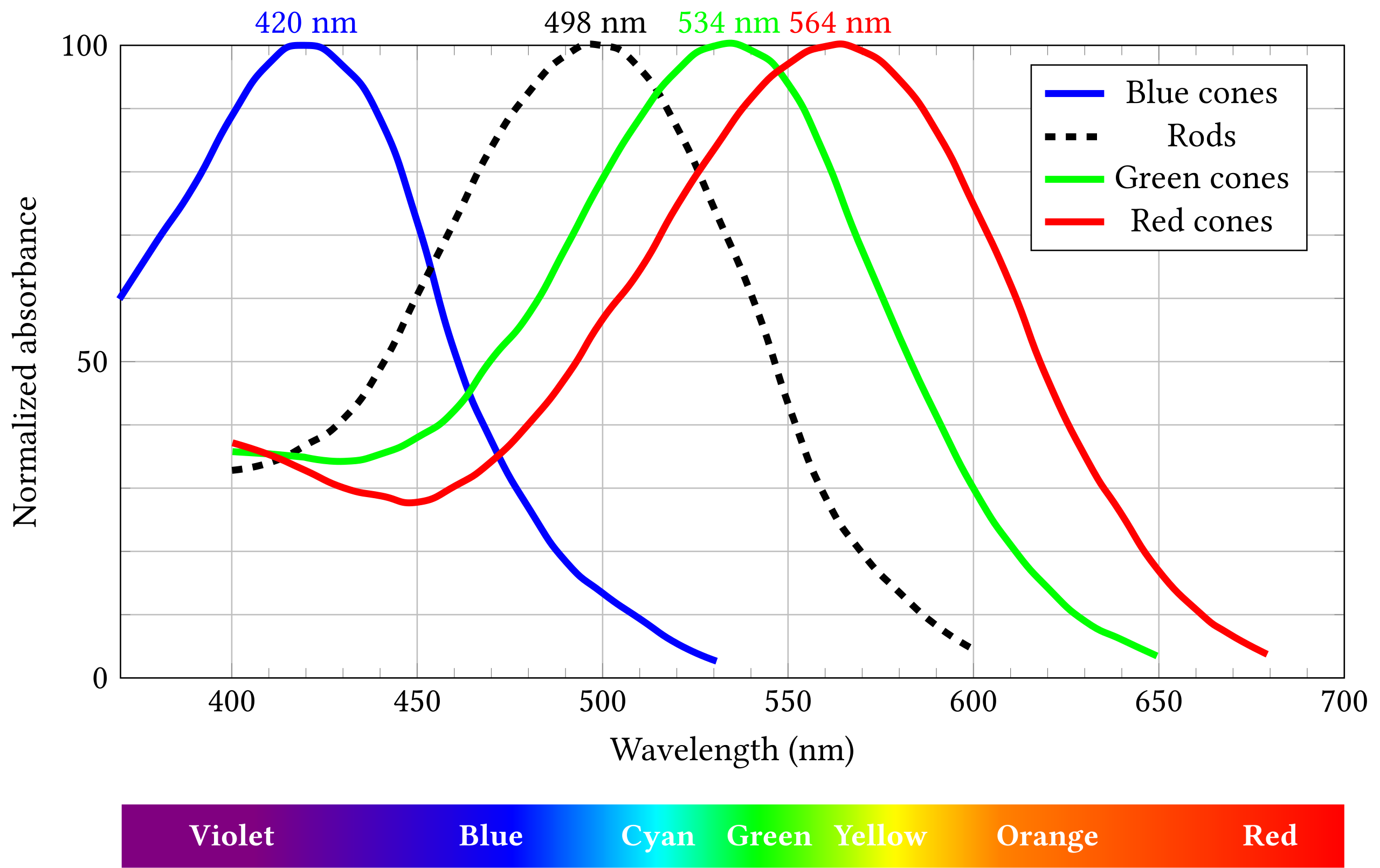 So one thing you can see is that the one called “Blue” is actually most sensitive to blue-violet, and then one called “Red” is actually most sensitive to yellow-green!