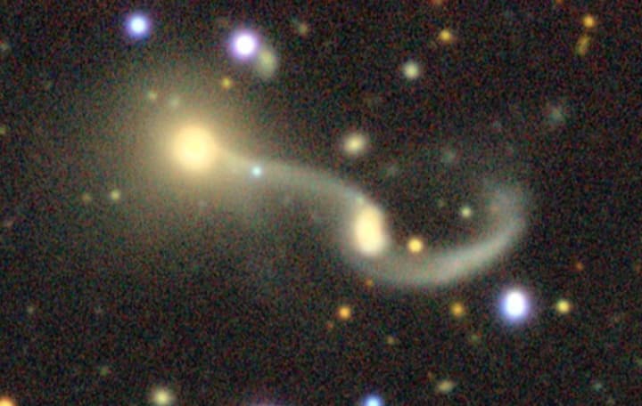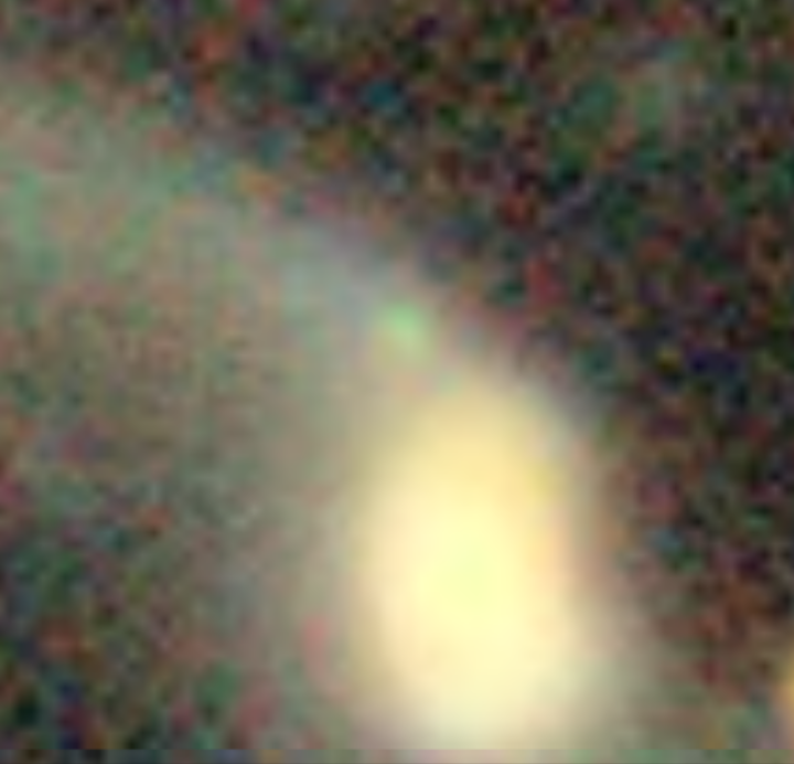 I noticed this galaxy doesnt show up in Simbad, just its companion. there also seems to be a greenish spot within it.